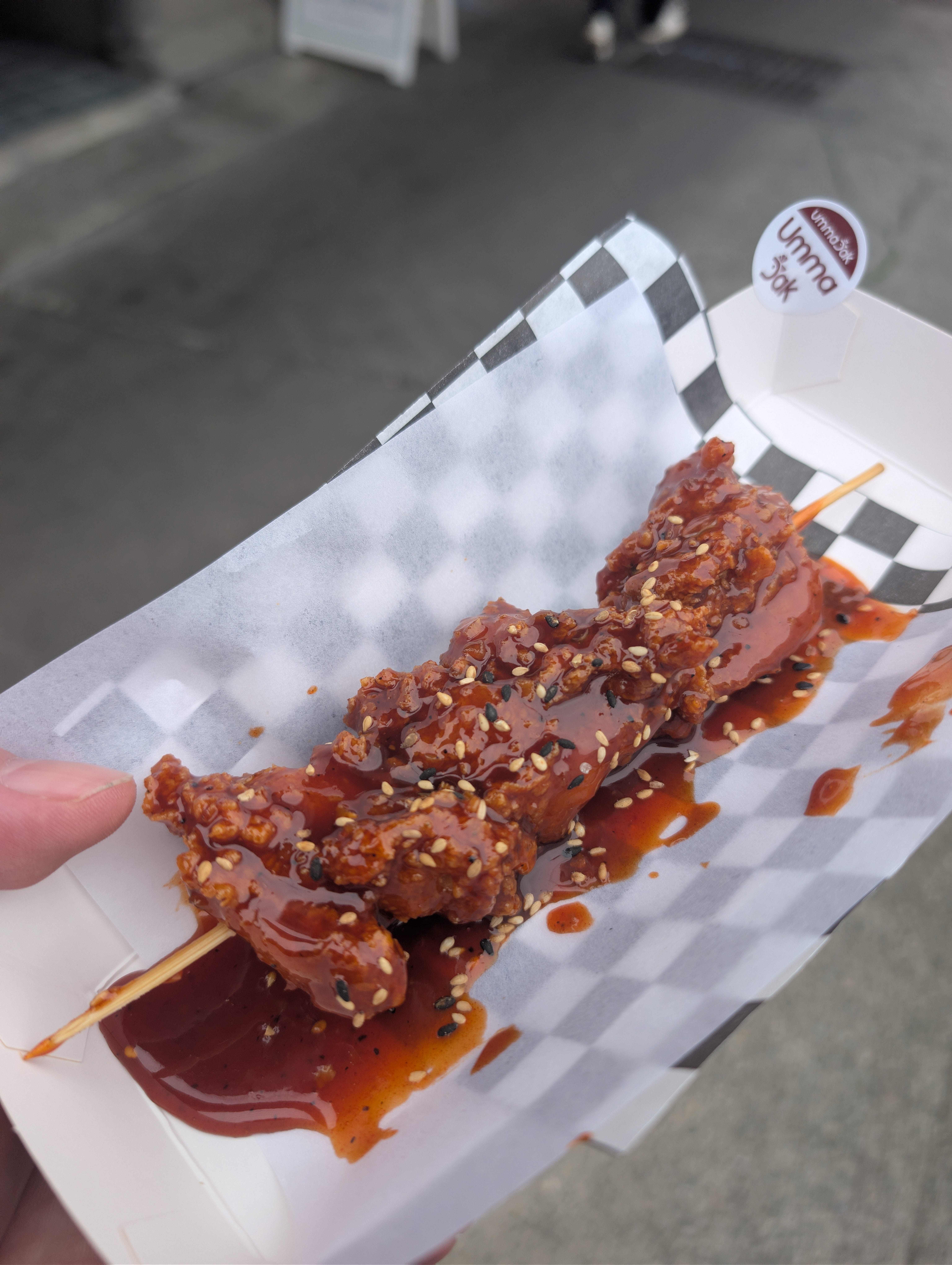 I took the Light Rail to the International District Station and the first restaurant was right across the street. Umma Dak had Korean fried chicken skewers. I got the sweet chili (if I remember correctly) and picked up a menu/guide. The skewer was great, like everything I had today.