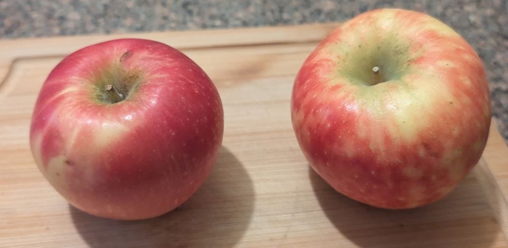 The one on the left is from the farmer’s market and the one on the right is from the regular grocery store. The farmer’s market apple was a good size smaller, more than it appears in the above photo. The flavor of the farmer’s market apple was sweeter and better tasting overall. The super market apple had a bitter after taste, similar to the brussels sprouts.
