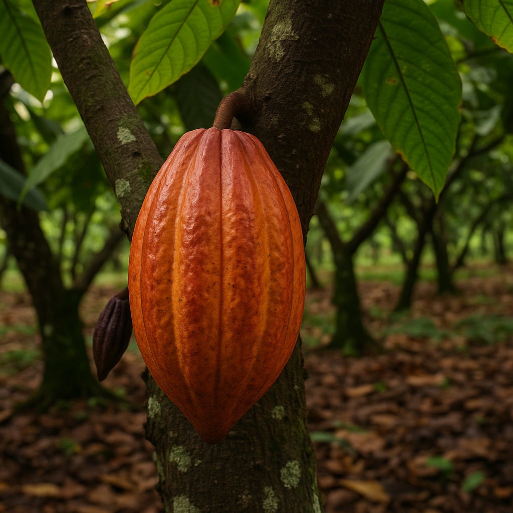 The cocoa tree grows in very humid regions of the world. Most of the world’s chocolate comes from West Africa, but South America is another major supplier. Like apple trees, there are different varieties, 13 different genetic varieties to be exact. They have different flavors and qualities. Some are more resistant to mold or produce more fruit than others. Unlike apples the fruit actually grows on the main trunk of the tree. There are usually around 35 fruit per tree. Because Cocoa trees need to be grown in shade, there’s another group of taller trees covering the cocoa trees providing a canopy.